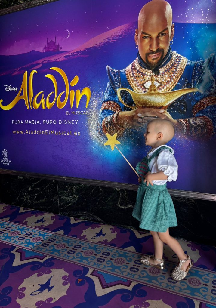 Su gran ilusión era viajar a Madrid y vivir la experiencia de ver un musical… y así lo hicimos. Subió al AVE con mucha emoción y, al llegar, disfrutó del musical de Aladdin desde muy cerquita. ¡Y como princesa que es, tuvo un saludo muy especial del mismísimo Príncipe!