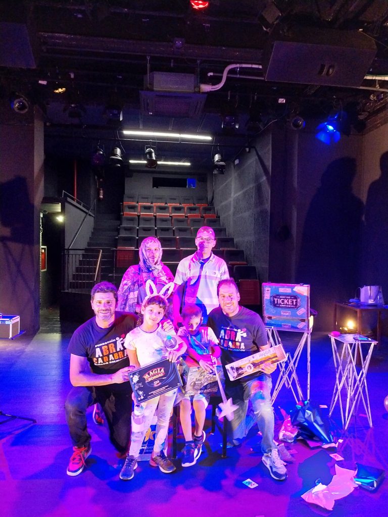 Gracias a la colaboración increíble de sala versus glories y apunta teatre, pudimos reservar un teatro entero solo para él. Mohamed y su inseparable prima disfrutaron de una actuación personalizada y muy especial a cargo de dos magos extraordinarios, David el Mag y Adan Xou.