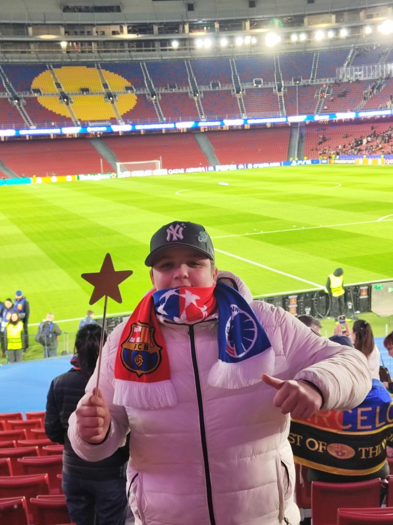 En la Estación del Norte de Valencia le esperamos con un cartel en el le decíamos que esa misma noche se iba al Camp Nou a ver jugar al Barça. Su reacción lo dijo todo… sonrisa gigante, ojos brillando y emoción a tope.