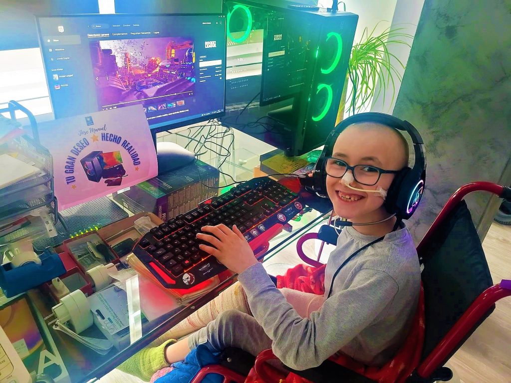 Hoy que se acaba el año os traemos un deseo especial. José Manuel es un gran fan del gaming y siempre que veía a sus yutubers favoritos pensaba que le encantaría tener un ordenador como el suyo para poder jugar a sus juegos favoritos.Una tarde no estaba muy animado porque le operaban al día siguiente. Así que nuestra varita  hizo su magia. Sonó el timbre de la puerta y su madre le dijo ¡José Manuel preguntan por ti! Cuando se acercó vio a un hada madrina con una estrella en la mano. Muy sorprendido y nervioso la cogió y siguió las indicaciones. Solo tenía que cerrar los ojos , pensar en su deseo y agitarla con todas sus fuerzas.Cuando los abrió no daba crédito a lo que veía, ¡había aparecido una enorme caja con su nombre! Rápidamente la abrió y al comprobar qué había su cara se iluminó, y con una gran sonrisa , no paraba de echarse las manos a la cabeza y decir ¡El ordenador, el ordenador! Entre sus manos tenía todo lo que había soñado; un pack de gamer, base, pantalla, teclado y ratón . Y sonriendo dijo ¡lo contaré en el hospital, mi gran deseo se ha cumplido y tengo que recuperarme cuanto antes porque en casa me espera mi ordenador!Gracias a la Fundación Adey por ayudarnos a hacerlo posible .