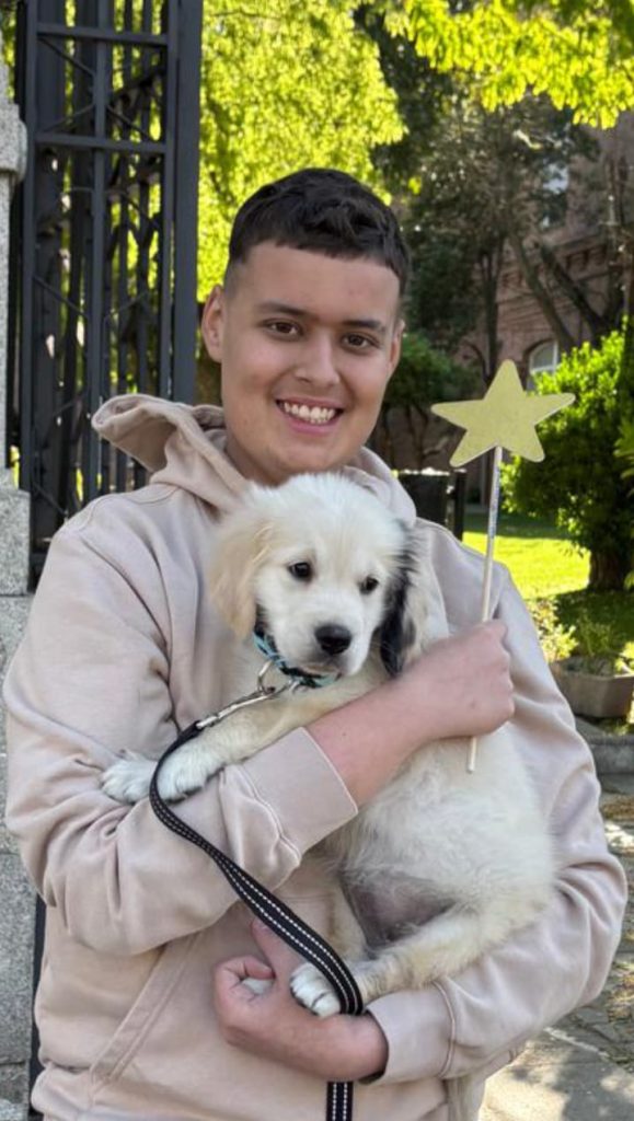 En la Fundación quisimos que ese deseo fuera más que especial. Planeamos junto a su hermano una sorpresa inolvidable: que él mismo le entregara el cachorro en Madrid. Y así fue. Zafiro llegó a sus brazos… y el brillo volvió a sus ojos.