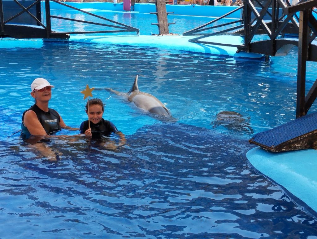 En Mundomar, vivió una experiencia inolvidable de delfinoterapia: nadó, cantó, los tocó e incluso les dio un besito. Su felicidad era indescriptible. Y después, siguió explorando el parque de animales marinos y disfrutó de un día increíble en Aqualandia.