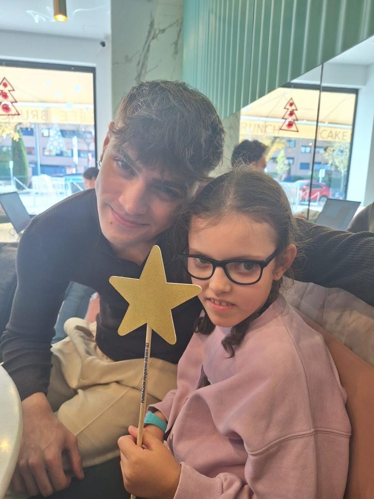 Una mañana, un Uber la recogió en casa junto a su madre. Ese día no iba al cole, ¡tocaba un plan diferente! Fueron a desayunar, donde nuestra voluntaria Marta la esperaba con algo muy importante: la varita mágica de Pequeño Deseo. Y entonces ocurrió… Apareció Gabriel, cercano y cariñoso, con muchas ganas de conocer a Valeria. A él le encantó su look, totalmente personalizado en su honor.
